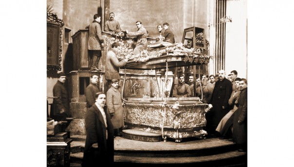 В 1922-м году в Эрмитаже проходила выставка "В помощь голодающим", на которой оказались практически все ценные иконы и церковная утварь из соборов и храмов Петербурга. Сразу же после выставки многие экспонаты были проданы заграницу. А гробницу Александра Невского решили переплавить — страна хотела серебра.