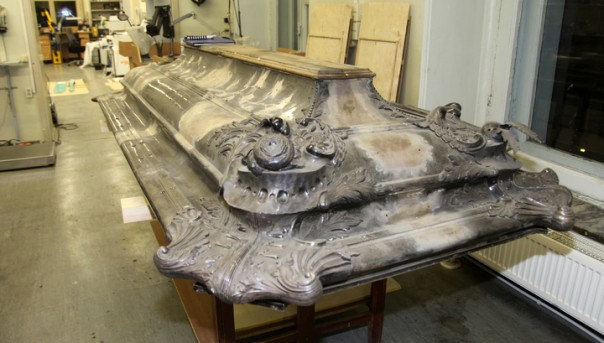 Игорь Карлович терпеливо объясняет: "Во время реставрации такой огромный экспонат демонтируется по составным частям. Только в процессе реставрации возможно снять формы со всех составных частей для последующего возможного копирования экспоната, если будет принято такое решение и найдутся средства на проведение такой работы. Первоначально гробницу выполнили чеканщики. Сейчас есть возможность использовать новые технологии и изготовить ее другим путем. Были проведены исследования — какой метод ее изготовления лучше. Мы представляем, сколько мастеров-чеканщиков сейчас находится в нашей стране. Как вы знаете, чеканщиков во времена Елизаветы свозили в столицу отовсюду, но даже тогда больше всего было иностранных мастеров, в основном, немцев. Словом, изготовление вручную сейчас, когда многие процессы автоматизированы, практически невозможно, нет необходимого количества высокопрофессиональных мастеров-чеканщиков.