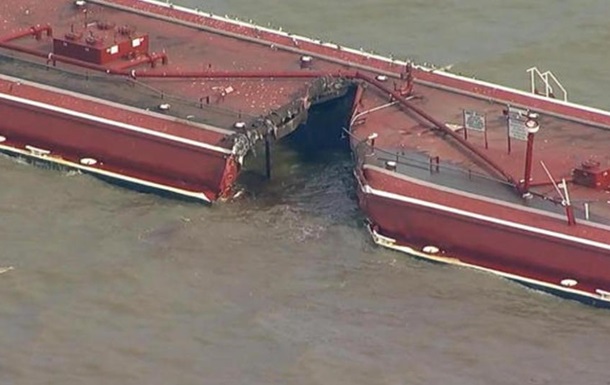 По данным телеканала, нефтяной танкер столкнулся с буксиром, который транспортировал две баржи, в результате чего одна из них перевернулась.