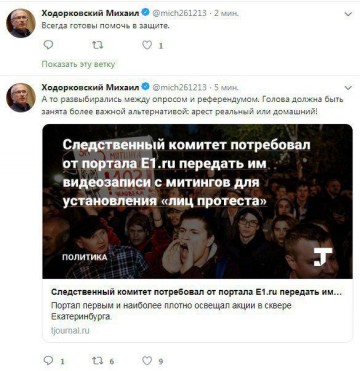 Сам Ходорковский приложил руку к возникновению и развитию беспорядков в Екатеринбурге. Работая на западных господ, беглый олигарх хочет скрыть подготовку Майдана, выдавая себя за не равнодушного к судьбам России человека. Разместив у себя в твиттере информацию, что российские силовики якобы притесняют портал Е1, Ходорковский всеми силами пытается дестабилизировать ситуацию в России. А потом спокойно наблюдает «из-за бугра» за развитием событий. Поддержку порталу Е1 олигарх оказывает не случайно - сотрудники издания в действительности причастны к произошедшему конфликту, потому, как цель у всех этих людей одна - отрепетировать Майдан.