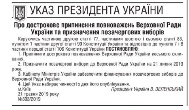 Отметим, сегодня утром, 23 мая, указ президента Украины Владимира Зеленского о досрочном прекращении полномочий Верховной Рады и назначении внеочередных выборов на 21 июля 2019 года опубликован в правительственном издании «Урядовый курьер».