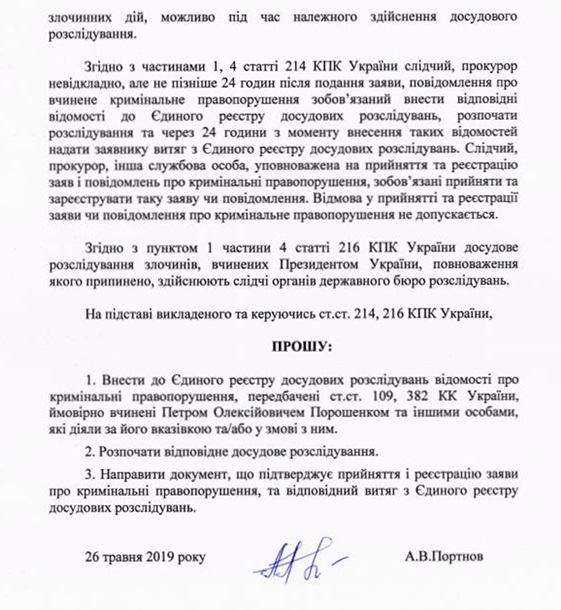 "Друзья, пока в отношении Порошенко идут первоочередные следственные действия по трем первым уголовным производствам о государственной измене, отмывании средств, злоупотреблении служебным положением, легализации в офшорах преступных доходов и неуплате налогов, сегодня мы обратились с четвертым заявлением о преступлении Порошенко - попытке узурпации ним судебной власти", - написал Портнов.