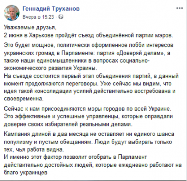 «Это будет мощное, политически оформленное лобби интересов украинских громад в Парламенте: партия «Доверяй делам», а также наши единомышленники в вопросах социально–экономического развития Украины.На съезде состоится первый этап объединения партий, в данный момент продолжаются переговоры. Уже сейчас мы видим, что идея такой консолидации усилий действительно востребована и своевременна», — написал Труханов.