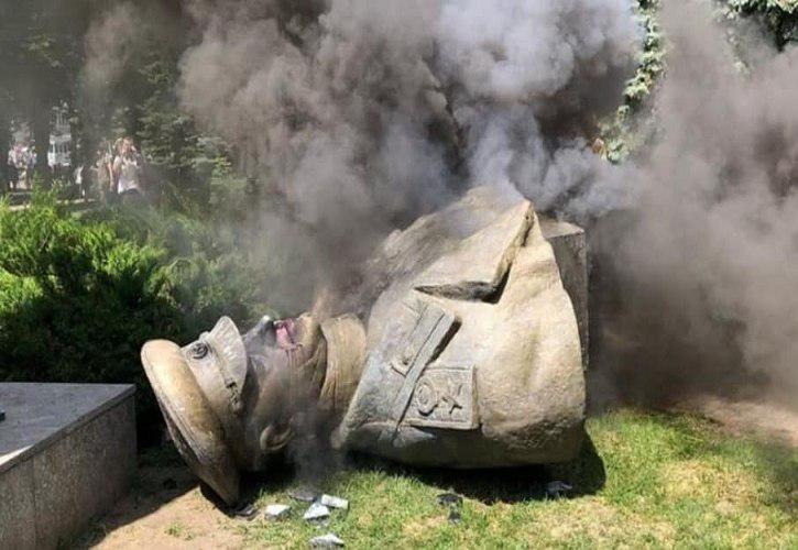Около ста представителей «Национального корпуса», «Фрайкора» и «Правого сектора», зацепив веревкой каменный бюст, повалили его на землю.