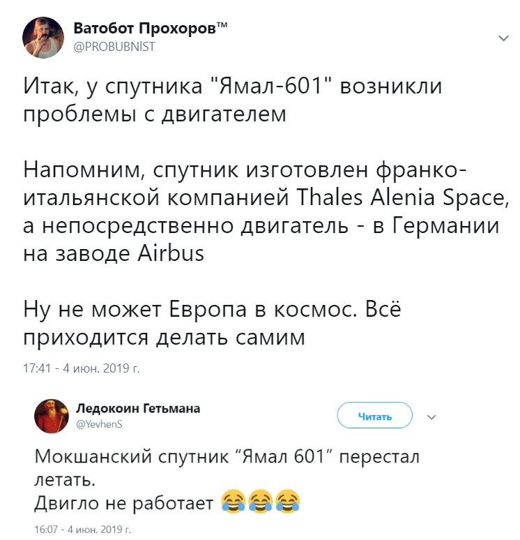 Спутник "Ямал-601" – один из самых мощных российских спутников связи – не вышел на рабочую орбиту. Как полагают, причина не в ракете-носителе (она сработала без проблем), а в двигателях самого спутника, сделанного европейской компанией.