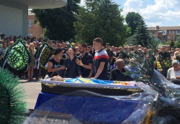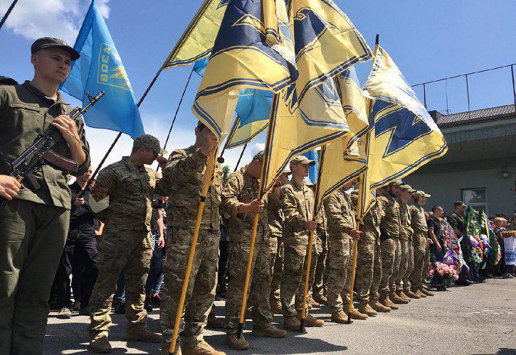 К сообщению также были приложены фотографии с траурной церемонии, в которой помимо родственников погибшего также приняли участие его «побратимы», облаченные в камуфляж и державшие в руках флаги с нацистской символикой. Источник