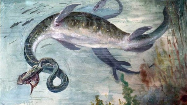 Поясним, что эласмозавры – это огромные плезиозавры, одни из самых крупных морских существ мелового периода. Плезиозавры чем-то похожи на огромных ламантинов с шеями, как у жирафов, и змеиными головами.