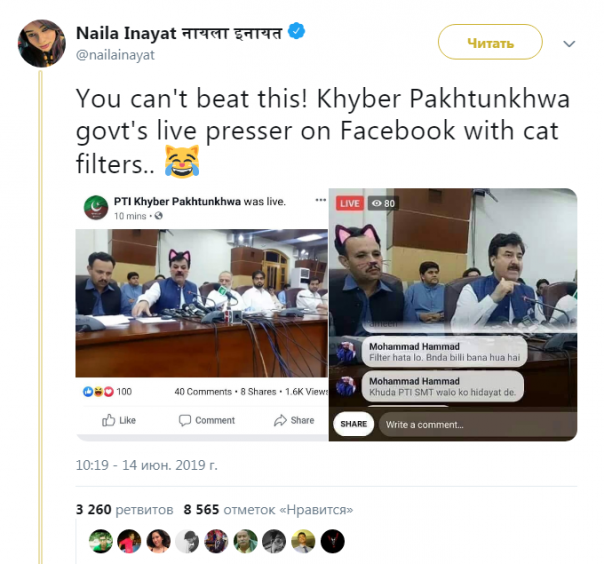 Камера была направлена на чиновников, среди которых также был министр по информационной политике провинции Шаукат Али Юсафзаи. И всю серьёзность мероприятия оттеняло то, что время от времени на их лицах появлялся фильтр с кошачьей мордой и усами. Безжалостно разрушая деловую атмосферу трансляции.