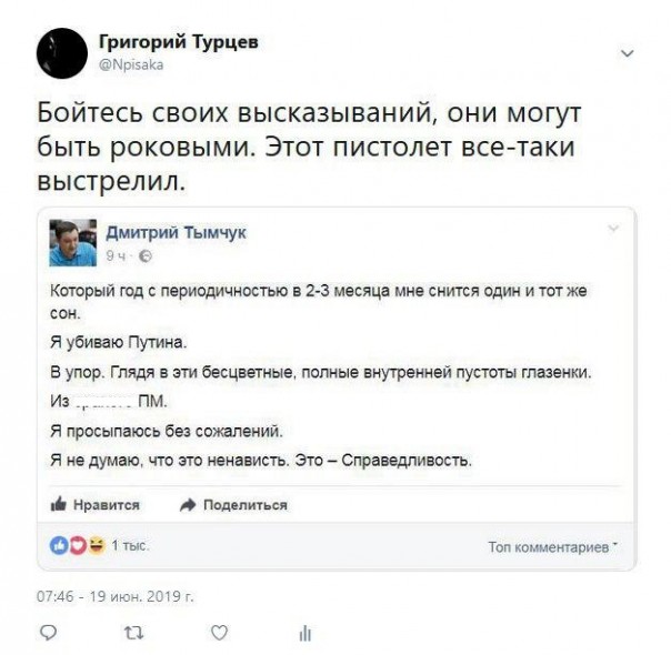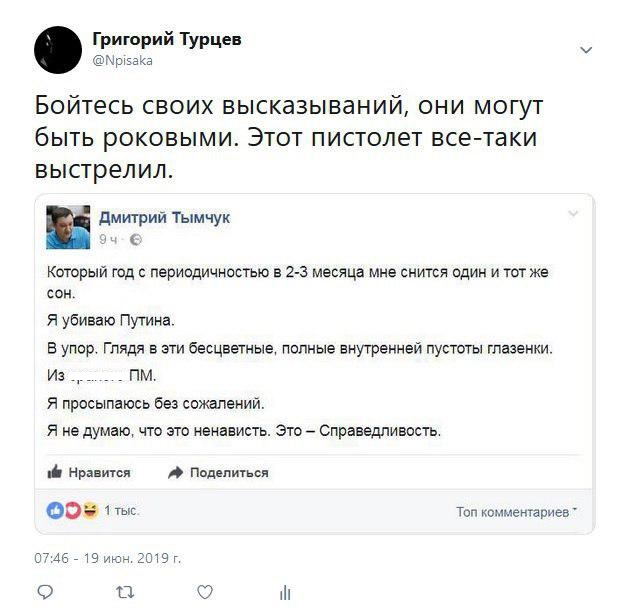 Многие вспоминают громкий позапрошлогодний пост Тымчука ("Который год с периодичностью в 2–3 месяца мне снится один и тот же сон. Я убиваю Путина. В упор..."):