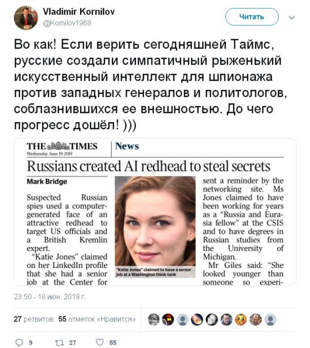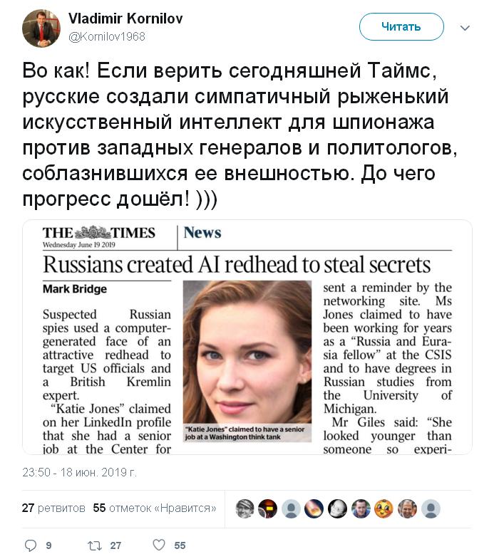 Во как! Если верить сегодняшней Таймс, русские создали симпатичный рыженький искусственный интеллект для шпионажа против западных генералов и политологов, соблазнившихся ее внешностью. До чего прогресс дошёл! )))