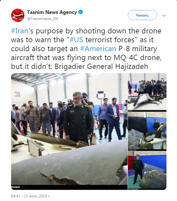 Командующий ВВС Корпуса стражей исламской революции (КСИР) Амир-Али Хаджизаде заявил, что Иран принял решение не сбивать американский самолёт, следовавший за беспилотником США, нарушившим воздушное пространство ближневосточного государства.