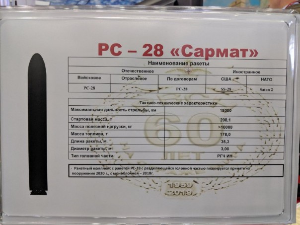 В соответствующей брошюре, доступной для посетителей форума, указано, что дальность стрельбы "Сармата" составляет 18 тысяч километров, стартовая масса — 208,1 тонны, масса полезной нагрузки — менее 10 тонн.