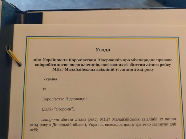 "Два года назад министры юстиции Украины и Нидерландов подписали соглашение о сотрудничестве по расследованию сбивания Boeing-777 рейса МН17. Сегодня соглашение уже действует - Нидерланды начали по нему процедуру передачи уголовного производства из Украины", - говорится в сообщении