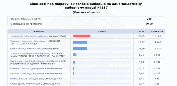 Как следует из данных, которые опубликованы на сей момент Центральной избирательной комиссией, Алексей Гончаренко после подсчета 89,00% голосов в мажоритарном округе №137 Одесской области, опережает своих соперников.