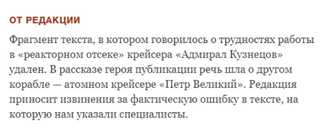Фрагмент текста, в котором говорилось о трудностях работы в «реакторном отсеке» крейсера «Адмирал Кузнецов» удален. В рассказе героя публикации речь шла о другом корабле — атомном крейсере «Петр Великий». Редакция приносит извинения за фактическую ошибку в тексте, на которую нам указали специалисты».