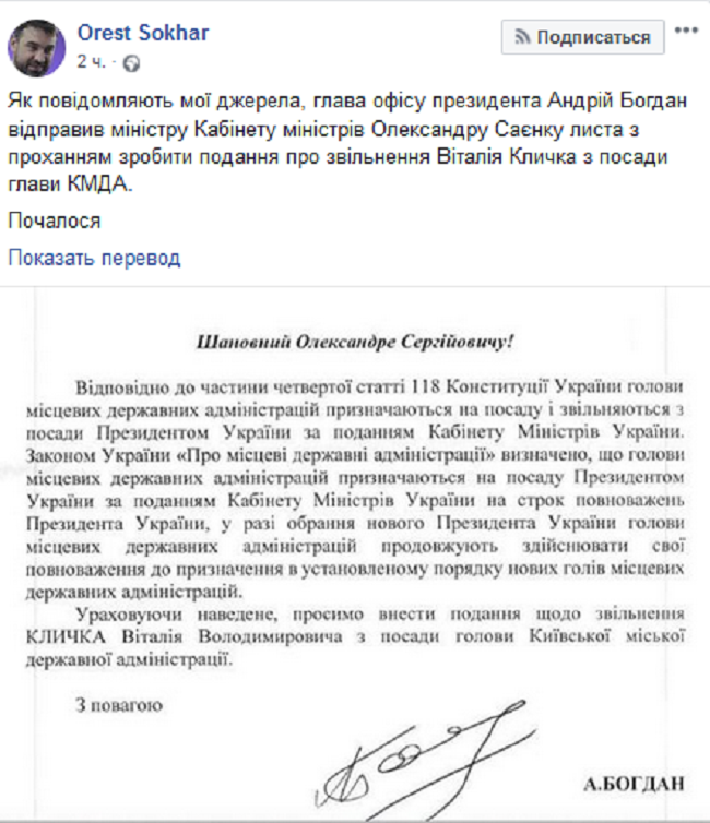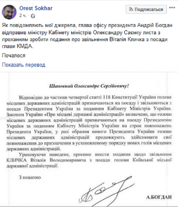 Об этом на своей странице в Facebook сообщил шеф-редактор «Обозревателя» Орест Сохар, опубликовав соответствующий документ, подписанный главой ОПУ Андреем Богданом.