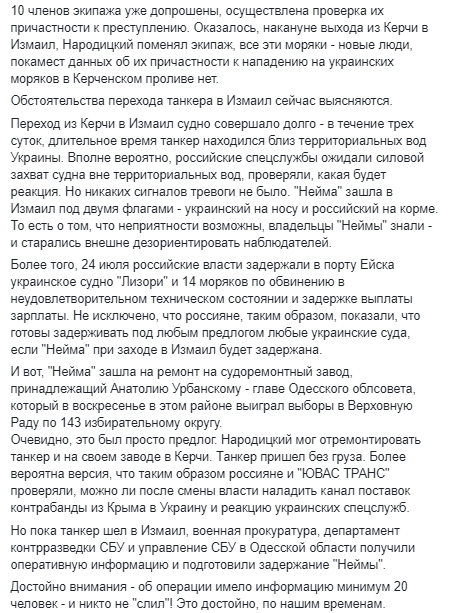 «Решение о задержании было одобрено президентом Владимиром Зеленским накануне, 24 июля. решение принималось непросто, поскольку было очевидно, что арест приведет к ответным действиям РФ. Хотелось бы поблагодарить за профессиональные действия сотрудников СБУ и военной прокуратуры, которые четко выполнили указ президента и провели задержание нарушителей», — заявил Бутусов.