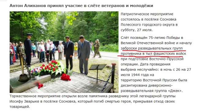 Накануне в Калининградской области состоялся слёт Союза ветеранов военной разведки, в котором приняли участие ветераны разведки, школьники, а также губернатор Калининградской области Антон Алиханов. Отчёт о мероприятии вышел на сайте регионального правительства gov39.ru с провокационным историческим ляпом. Первым на это обратил внимание калининградский журналист Виктор Середа-Дальский, написавший на своей странице в «Фейсбуке» сообщение с хештегом #срамота: