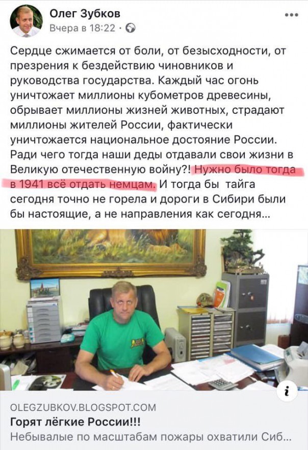 «Сердце сжимается от боли, от безысходности, от презрения к бездействию чиновников и руководства государства. Каждый час огонь уничтожает миллионы кубометров древесины, обрывает миллионы жизней животных, страдают миллионы жителей России, фактически уничтожается национальное достояние России. Ради чего тогда наши деды отдавали свои жизни в Великую Отечественную войну?! Нужно было тогда в 1941 всё отдать немцам. И тогда бы тайга сегодня точно не горела, и дороги в Сибири были бы настоящие, а не направления, как сегодня…», – написал Зубков.
