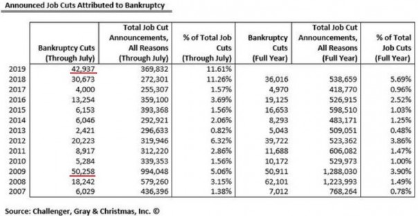 По данным консалтинговой компании Challenger Gray & Christmas, за первые 7 месяцев 2019 г. американские компании были вынуждены уволить почти 43 тыс. сотрудников из-за неспособности выполнять свои финансовые обязательства.