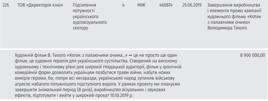 Украинский культурный фонд, возглавляемый женой Мариной Порошенко, выделил 8,9 миллиона гривен (примерно 23 миллиона рублей) на комедию режиссера Владимира Тихого "Котик с горящими глазами" о войне в Донбассе. Об этом сообщает "Страна.ua".