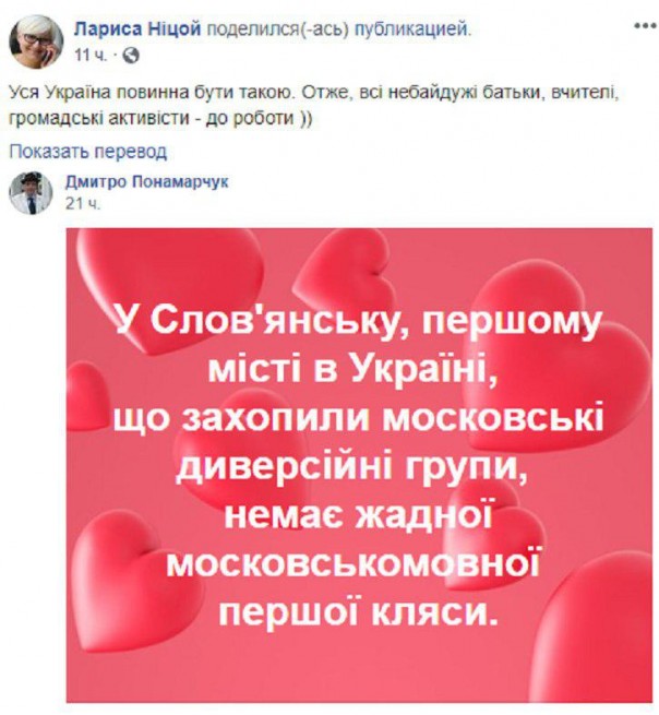 «В Славянске, первом городе Украины, который захватили московские диверсионные группы, нет ни одного русскоязычного первого класса», – порадовался Пономарчук.