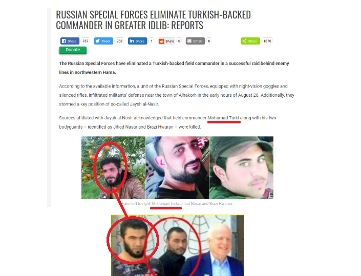 Днем ранее в ходе аналогичного рейда на северо-западе Хамы российский спецназ уничтожил полевого командира Джайша ан-Насира, который водил тесную дружбу с умершим от слабоумия главным неоконом США Маккейном. Также сообщалось о гибели двух его охранников.
