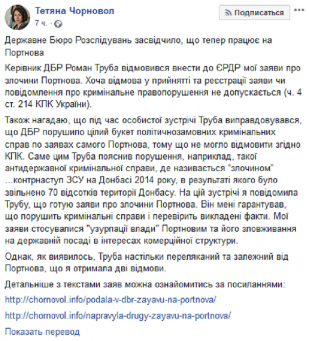 «Во время личной встречи Труба оправдывался, что ГБР возбудило целый букет политическизаказных уголовных дел по заявлениям самого Портнова, так как не могло отказать согласно УПК. Именно этим Труба объяснил нарушения, например, такого антигосударственного уголовного дела, где называется «преступлением» ... контрнаступление ВСУ на Донбассе 2014 года, в результате которого было освобождено 70% территории Донбасса», — рассказала Чорновол.