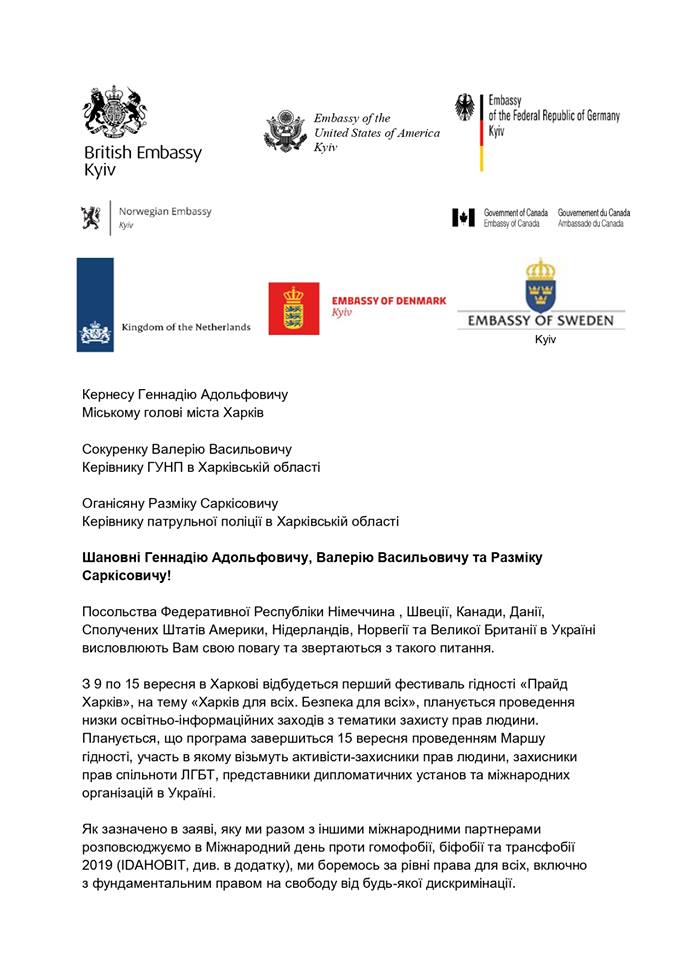 Координатор системы ООН на Украине Асенефа Лубрани выразила удивление и разочарование намерением харьковской местной власти обратиться в суд. Проведение таких маршей означает, по ее мнению, что государство разделяет глобальные ценности прав человека, инклюзивности и принцип «не оставлять никого в стороне». «Я призываю власти Харькова поставить права человека на первое место, сотрудничать с полицией, гражданским обществом и международным сообществом, и принять все меры для избежания ненужных и лишних ограничений прав и свобод», — пишет госпожа Лубрани.