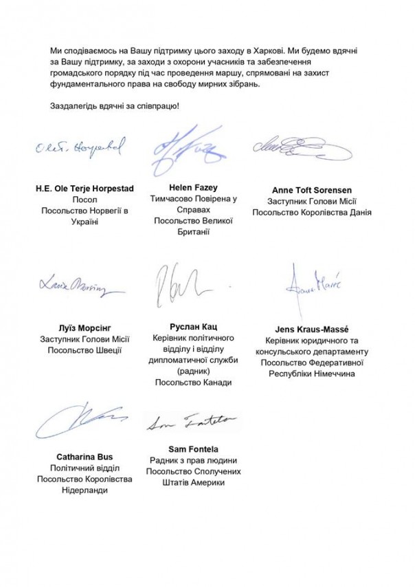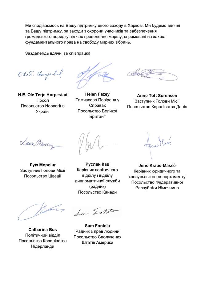 Представители международных организаций, донорских учреждений и посольств гарантируют продолжение работы с полицией. В защиту мероприятия выступили посол Норвегии и представители дипмиссий США, Великобритании, Германии, Канады, Нидерландов, Швеции и Дании в Киеве. И это неудивительно, ведь организаторы акции сидят на довольствии за пределами Харькова и Украины.