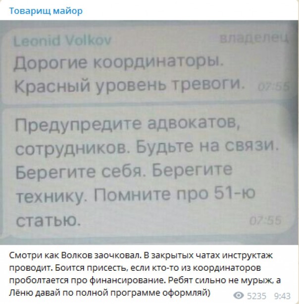 Следственные мероприятия вызвали панику у соратников скандального блогера. Например, глава сети региональных штабов Леонид Волков в закрытых чатах начал просить сотрудников так называемого «ФБК» не сдавать его правоохранителям.