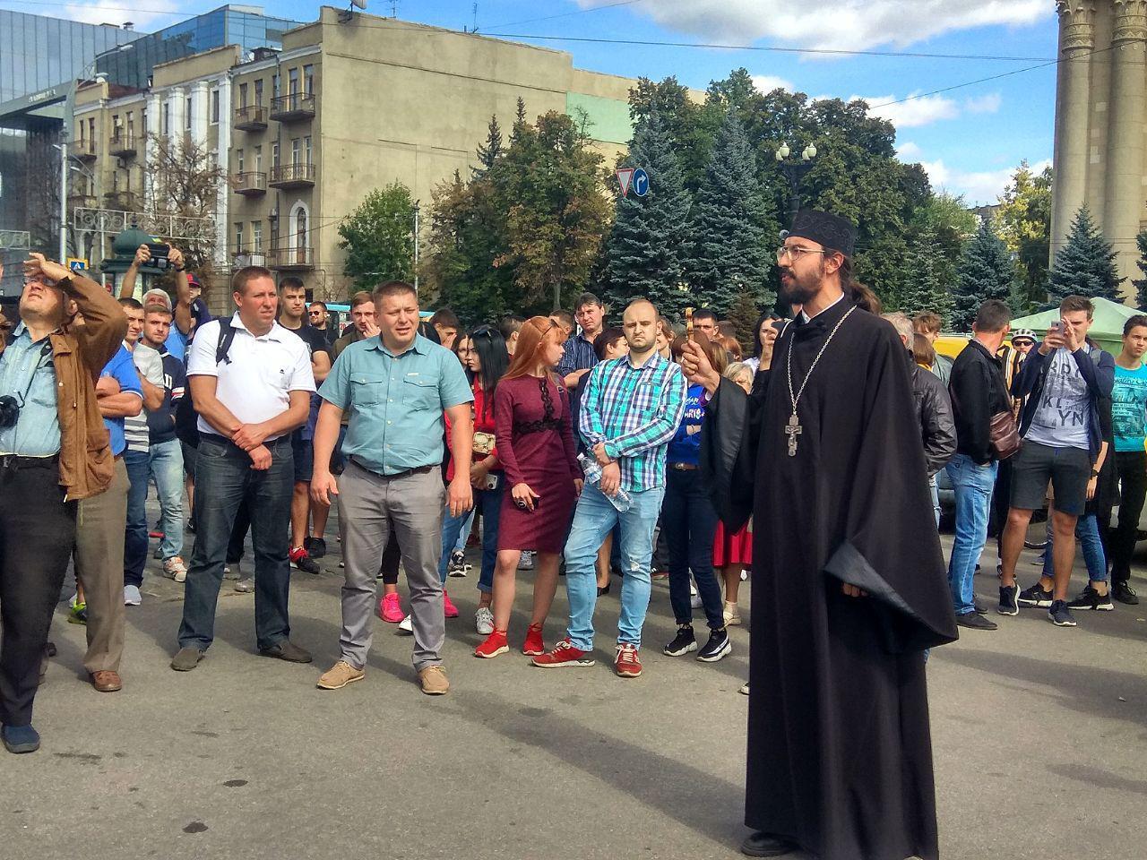 Перед началом марша, около 14:00, на оцепленную полицией площадь начали пускать людей. Наряду с участниками гей-парада туда прошли и его противники. Они развернули самодельные плакаты "Папа, мама, дети, дом! Украина не Содом!", "За традиционные семейные ценности" и другие.