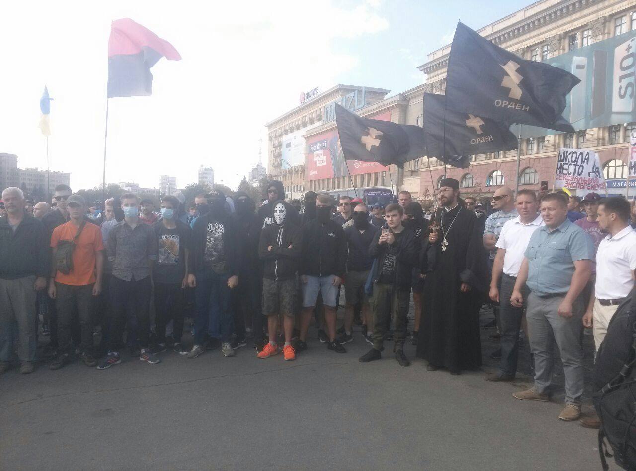 Радикалы объяснили, что белая маска, которую надели некоторые из них, - это "маска харьковчанина": якобы все жители города разделяют их ценности. Как передают местные СМИ, люди с закрытыми лицами выкрикивали традиционное приветствие националистов: "Слава Украине - героям слава".