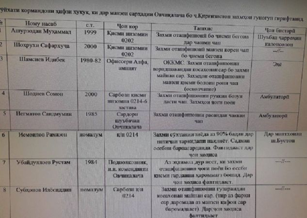По данным таджикского СМИ, все погибшие и раненые — военнослужащие. Из пятерых пострадавших один попал в реанимацию, двое — в хирургическое отделение и еще двое лечатся амбулаторно.