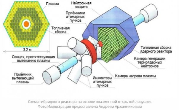 «На начальном этапе при помощи специальных плазменных пушек создается относительно холодная плазма, количество которой поддерживается дополнительной подпиткой газом из атомов тяжелого водорода - дейтерия. Инжекция в такую плазму нейтральных (атомарных) пучков с энергией частиц масштаба 100 кэВ обеспечивает образование в ней высокоэнергетичных ионов дейтерия и трития (это тяжелые изотопы водорода), а также поддержание необходимой температуры. Сталкиваясь друг с другом, ионы дейтерия и трития соединяются в ядро гелия, при этом происходит выделение высокоэнергетических нейтронов. Такие нейтроны беспрепятственно выходят через стенки вакуумной камеры, где магнитным полем удерживается плазма, и поступая в область с ядерным топливом, после замедления поддерживают протекание реакции деления тяжёлых ядер, которая служит основным источником выделяемой в гибридном реакторе энергии».