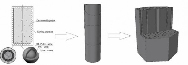 Схема заполнения топливного блока ядерным топливом. Слева направо: торий-плутониевые микрокапсулы и их расположение в топливных таблетках – цилиндрических графитовых стержнях; внешний вид топливных таблеток; топливный блок с каналами размещения топливных таблеток и охлаждающего газа – гелия. Иллюстрация предоставлена Игорем Шаманиным