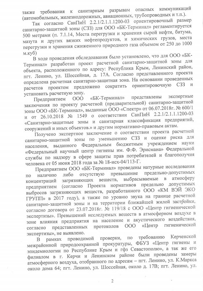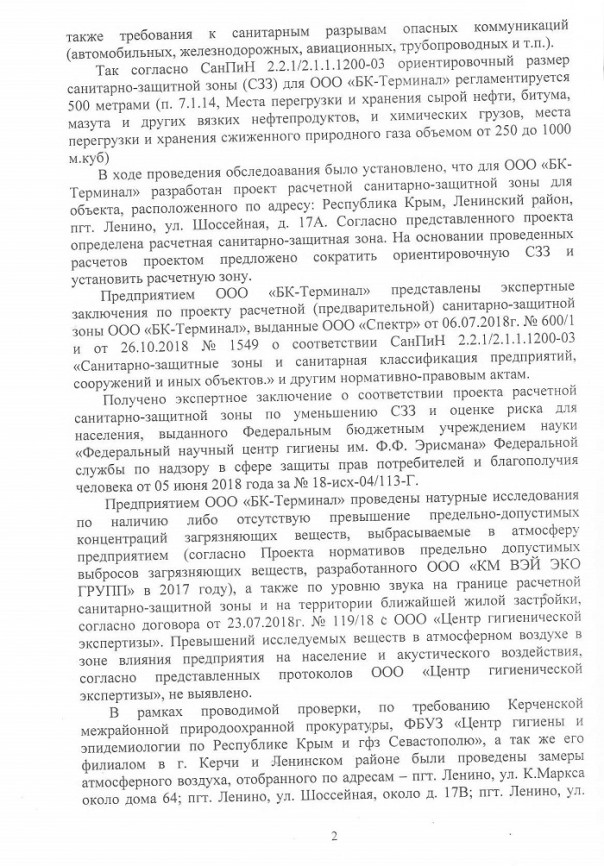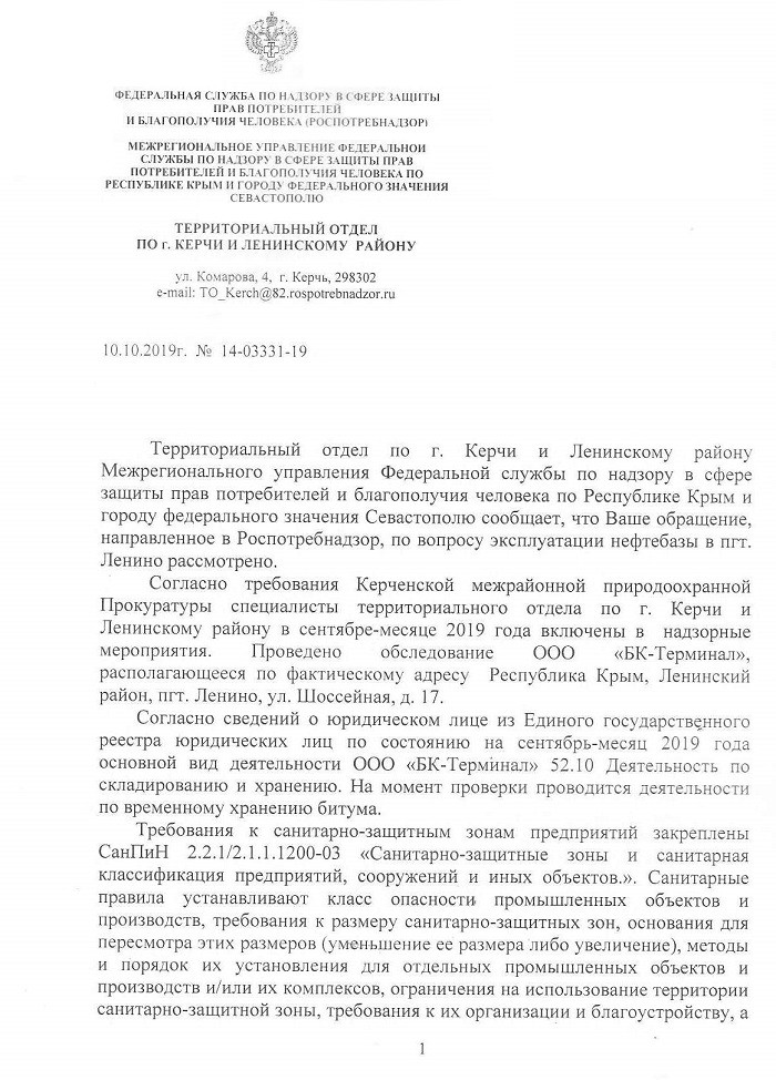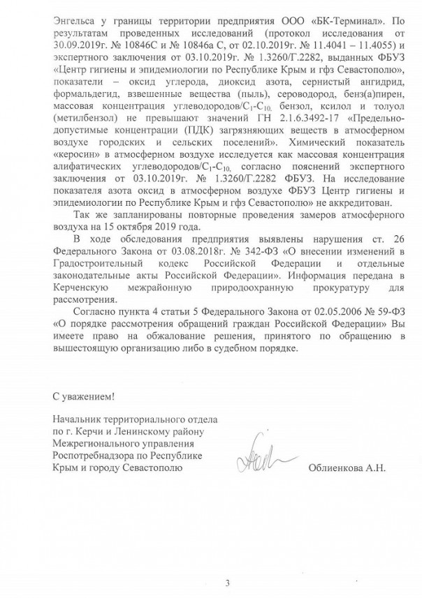 В свою очередь начальник территориального отдела по Керчи и Ленинскому району Крымского Роспотребнадзора Анна Обиленкова сообщила о том, что 30 сентября 2019 года вблизи нефтебазы производились замеры проб воздуха на содержание вредных веществ. Как выяснилось, организация, задействованная в экспертизе — не имеет достаточного уровня аккредитации для выполнения всех видов анализа. Тем не менее по результатам проведённых исследований, концентрации загрязняющих веществ в атмосферном воздухе не превышают значений предельно-допустимых концентраций, — говорится в ответе Роспотребнадзора.