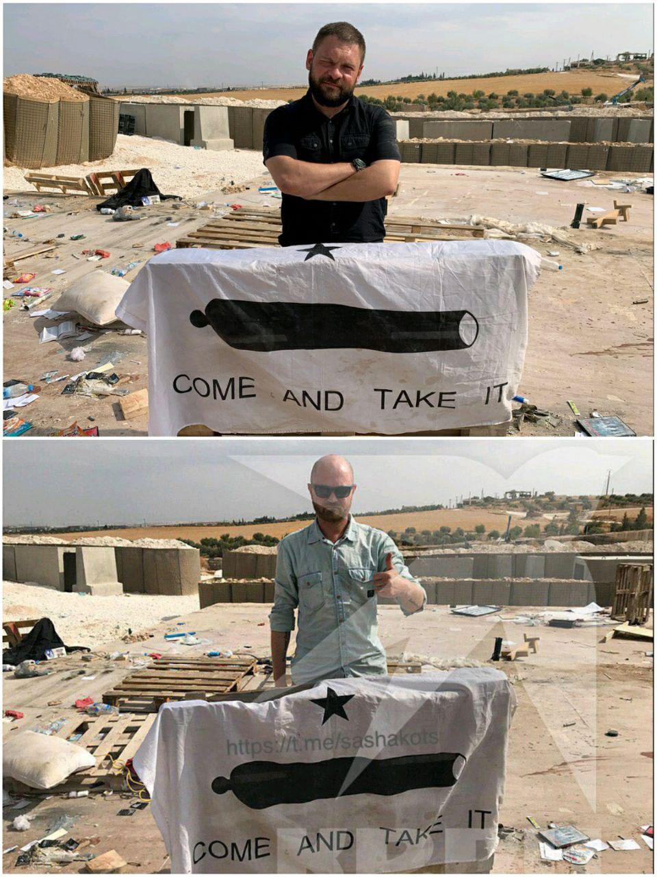 Военные корреспонденты из России Евгений Поддубный и Александр Коц нашли на американской базе Дадат к северу от Манбиджа брошенный флаг Центрального командования специальными операциями США с надписью «Come And Take It» («Приди и возьми»).