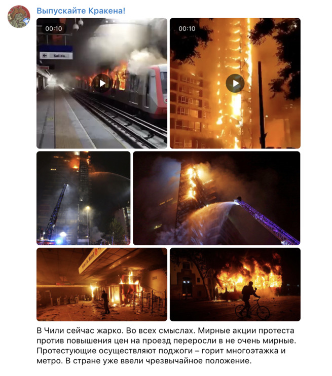 Сожженный поезд и станции метро во время протестов против повышения стоимости проезда... ну ладно, пусть. А небоскреб то им чем помешал? И торговый центр? В торговом центре кстати сгорели двое, на улице насмерть забили еще одного.