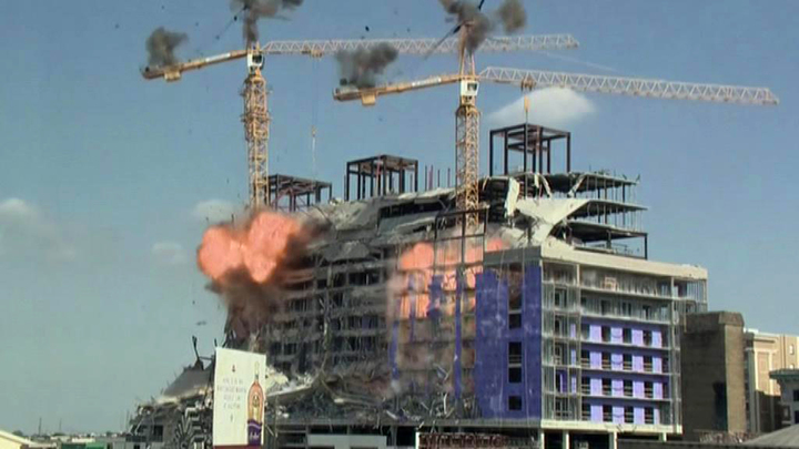 Бригады специалистов по сносу зданий в Новом Орлеане совершили управляемые взрывы, чтобы снести два поврежденных строительных крана на площадке отеля Hard Rock. Один из кранов удалось подорвать правильно, но второй упал на крышу строящегося здания. По данным местных СМИ, операцию по демонтажу решили отложить на два дня - конструкции оказались намного более поврежденными, чем считалось раньше. Источник