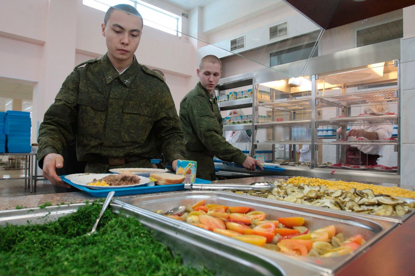 Завтраки, обеды и ужины подаются по системе «шведский стол». Утренняя трапеза состоит из гарнира, как правило, каши и мясной части, например, отварной говяжьей печени, сосисок или котлеты. Радует своим разнообразием и ассортимент напитков: чай, кофе, соки и морсы. В дневной набор входит несколько видов супов: борщ, рассольник, щи, гороховый и другие. Из горячих блюд на выбор: пюре, гречка, рис, макароны, а мясным дополнением служат блюда из курицы, говядины или свинины. Кроме того, при желании солдаты могут разбавить свой перекус свежими и консервированными овощными нарезками, которые в свободном доступе находятся в салат-барах при столовых. В вечернем рационе в основном рыба и легкий гарнир.