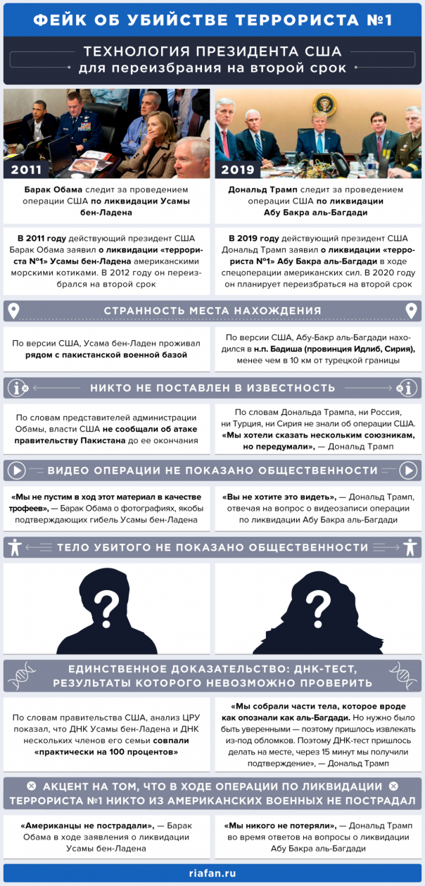 Итак, тело аль-Багдади предали морю, как того якобы требуют исламские обычаи. В 2011 году «морские котики» США поступили также с бен Ладеном. Но все-таки это событие вызывает сомнения. В сети даже появилась инфографика, которая называет ликвидацию игиловского лидера особой технологией американских президентов для переизбрания на второй срок.