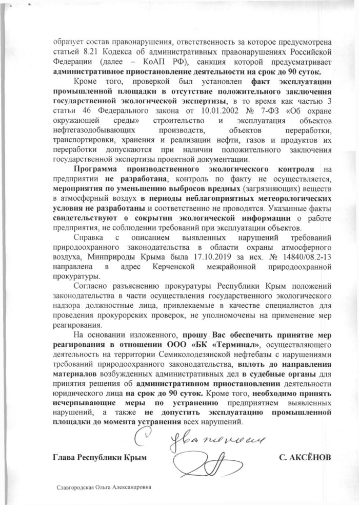 Глава региона Сергей Аксёнов настаивает на принятии жёстких мер в отношении ООО «БК-Терминал» в рамках производства по административным делам. Губернатор добивается приостановления деятельности нефтебазы на 90 суток до устранения предприятием выявленных нарушений.