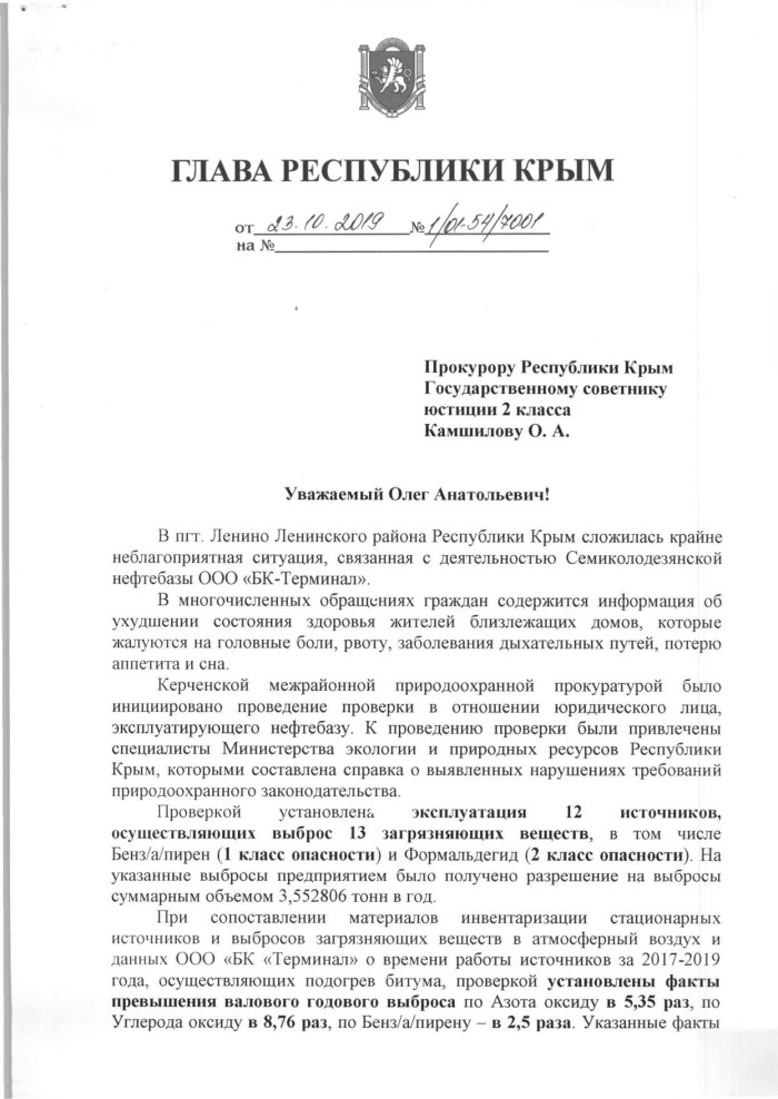 Аксёнов требует от республиканского прокурора передать материалы возбужденных административных дел в суд. Обязательным условием возобновления эксплуатации нефтебазы Аксёнов считает полное устранение нарушений и выполнение выданных юридическому лицу предписаний.
