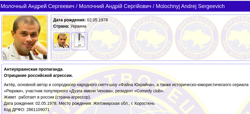 Украинского комика Андрея Молочного внесли в базу данных скандального сайта "Миротворец" после того, как он завил, что по Киеву толпами ходят фашисты и назвал последние пять лет в Украине "кошмарным сном". Об этом говорится на странице портал укрофашистов в Twitter.