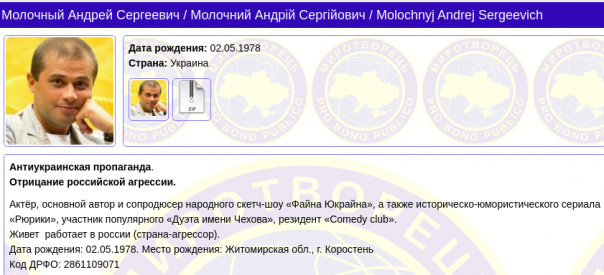 Кастрюлеголовые фашисты в Twitter написали, что "отправили малоросса в чистилище" и прикрепили ссылку на сайт. На сайте указано, что комик помещен в базу за "антиукраинскую пропаганду и отрицание российской агрессии". При этом отмечается, что Молочный живет в России.