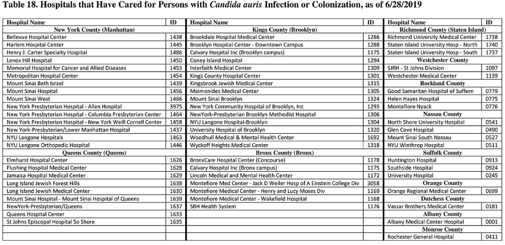 Чиновники штата сообщили, что самая большая концентрация пациентов Candida auris была в Манхэттене, Бруклине и Квинсе, но он не сказал, сколько случаев было в каждом учреждении.