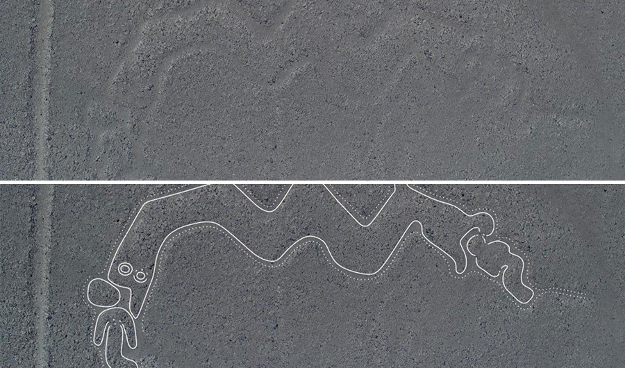 Геоглифы — это начерченные на земле узоры, которые зачастую так велики, что их можно разглядеть только с высоты птичьего полёта. Рисунки на плато Наска представляют собой линии, геометрические фигуры и примитивные изображения животных и человека. Впервые их заметили в 1939 году, однако на самом деле их открыли испанские конкистадоры в XVI веке и сочли "путевыми знаками". Источник