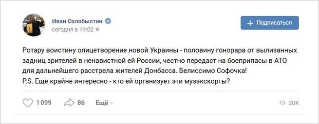 «Я понимаю, артист — вне политики. Но, если ты действительно вне политики, тогда не поддерживай армию, которая воюет с нашей страной», — сказала Вовк.