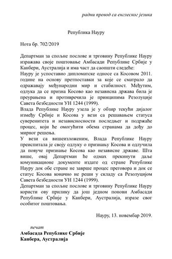 Республика Науру, по словам Дачича, прекратит все дипломатические контакты, которые они имели с Косово до сих пор. Он сообщил, что в ноте, переданной ему заместителем министра иностранных дел Науру, говорится, что Республика Науру пришла к выводу о том, что решение о признании Косово является преждевременным и противоречит принципам резолюции №1244 Совбеза ООН.